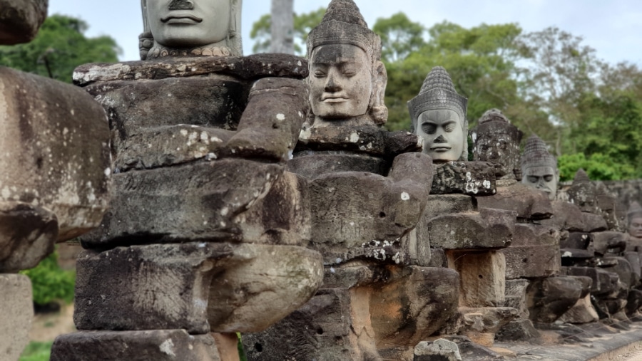アンコール・トムは、12世紀後半に造られた古代都市で、日本では鎌倉時代にあたります。都市の大きさは一辺約3kmで、城壁とお堀に囲まれています。