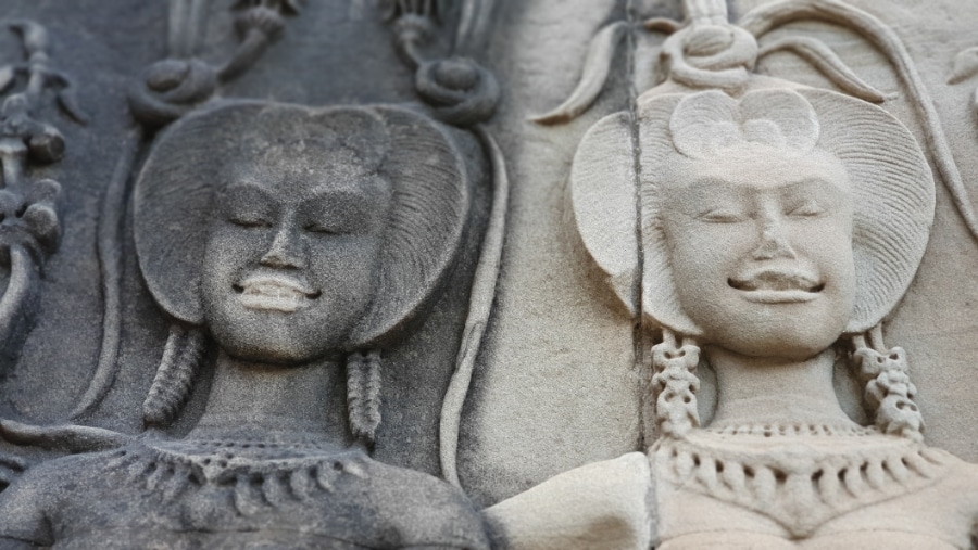 寺院の壁には、当時(日本では鎌倉時代)のカンボジアの人々の生活や戦争の様子などが、見事なレリーフとして彫刻されています。また、たくさんの塔に刻まれた「四面仏の顔」でも有名な遺跡です。