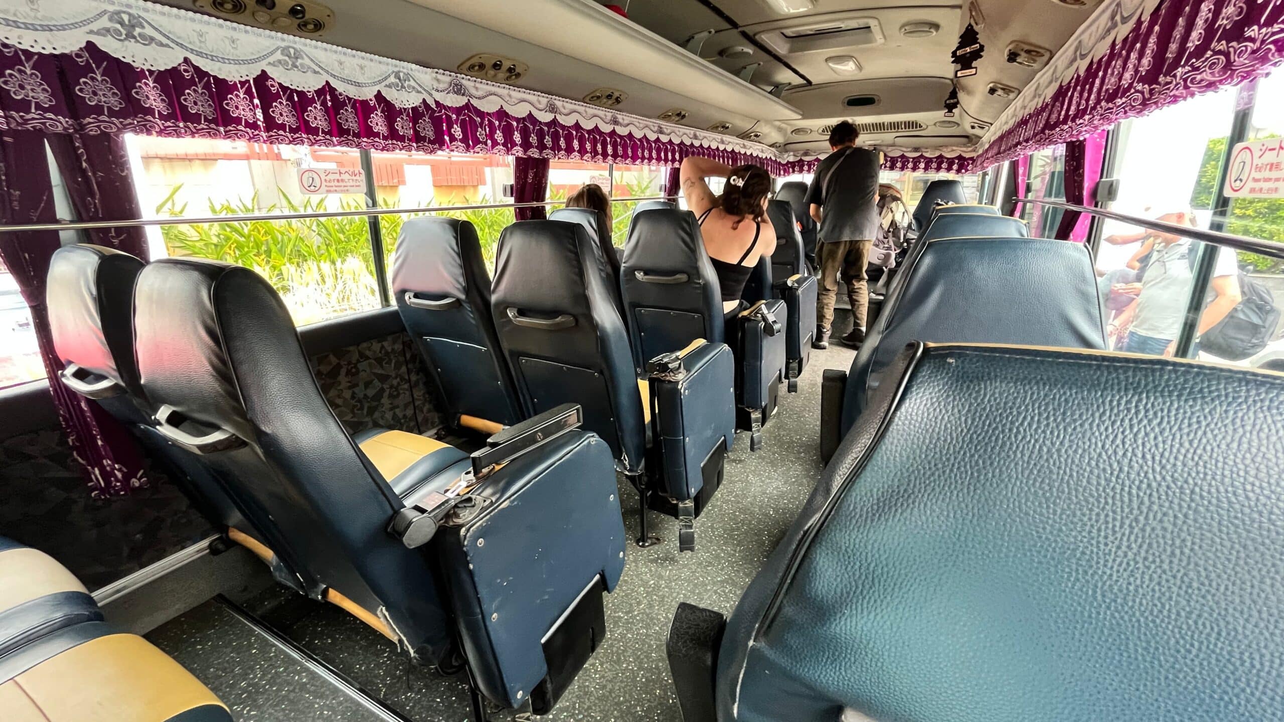バスの車内はちょっと古めの中型バス。きちんとエアコンもついています。